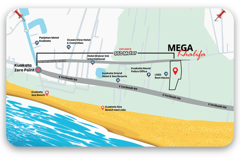 The upcoming five-star MEGA Khalifa Hotel is set to be developed with international-standard facilities, offering guests a world-class hospitality experience. The hotel promises unparalleled convenience and accessibility. Its prime location, combined with luxurious amenities, positions it as a premier destination for both leisure and business travelers, as well as a high-potential investment opportunity. Strategically MEGA Khalifa Hotel located in the designated Hotel and Motel Zone at Kuakata, it offers prime access to Kuakata's key landmarks. Just moments away from Kuakata Zero Point, the hotel also enjoys close proximity to Kuakata Sea Beach, Payra Port, and the upcoming International Airport.